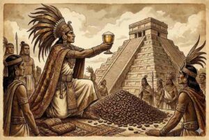 その後、マヤ文明やアズテカ文明において、カカオはさらに神聖視されるようになります。アズテカの伝説では、神ケツァルコアトルが人間にカカオをもたらしたとされ、「神の食べ物(テオブロマ)」と呼ばれました。実際、カカオ豆は通貨としても流通し、「豆100粒で奴隷一人と交換できる」と言われるほど貴重なものだったと感じました。当時の王様は、戦いへの活力を得るための「不老長寿の薬」として、一日に何十杯も飲み干していたというから驚きですよね。